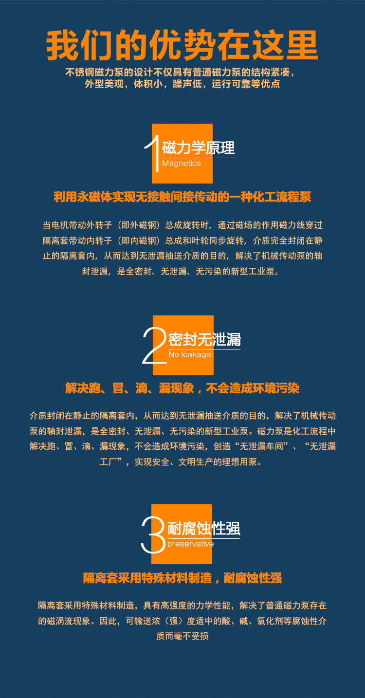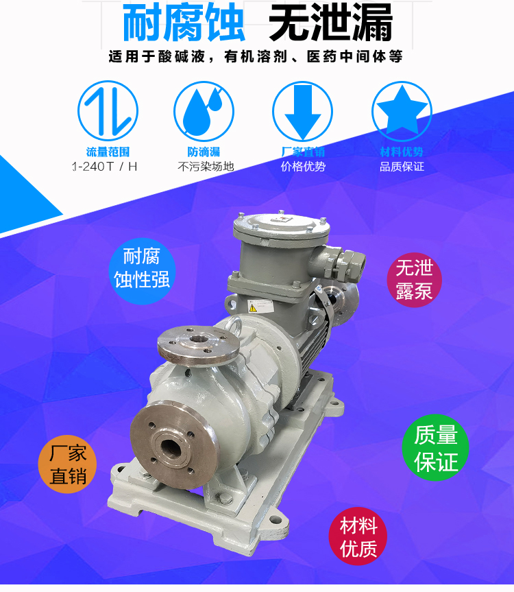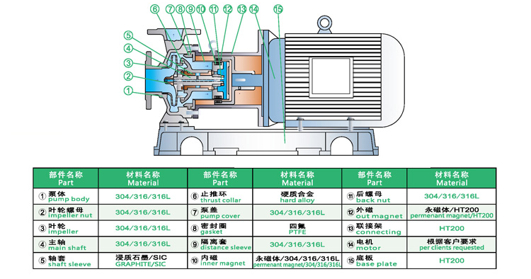 WJC不銹鋼磁力泵過(guò)流部件采用全不銹鋼材料(304、316、316L),內(nèi)、外磁轉(zhuǎn)子選用高磁能積、高矯頑力的稀土永磁制造,具有高效節(jié)能、介質(zhì)適用面廣、耐高溫、磁性強(qiáng)、不退磁等優(yōu)點(diǎn),對(duì)有機(jī)酸,有機(jī)化合物,堿,中性溶液和各種氣體都有良好的耐蝕性,雙螺旋糟碳石墨軸承和硬質(zhì)合金軸套,具有較強(qiáng)的耐磨性,是應(yīng)用磁力耦合實(shí)現(xiàn)無(wú)接觸傳動(dòng)、無(wú)動(dòng)密封的新型高品質(zhì)磁力化工泵。保證了產(chǎn)品的壽命,是無(wú)泄漏輸送腐蝕性介質(zhì)的理想用泵。